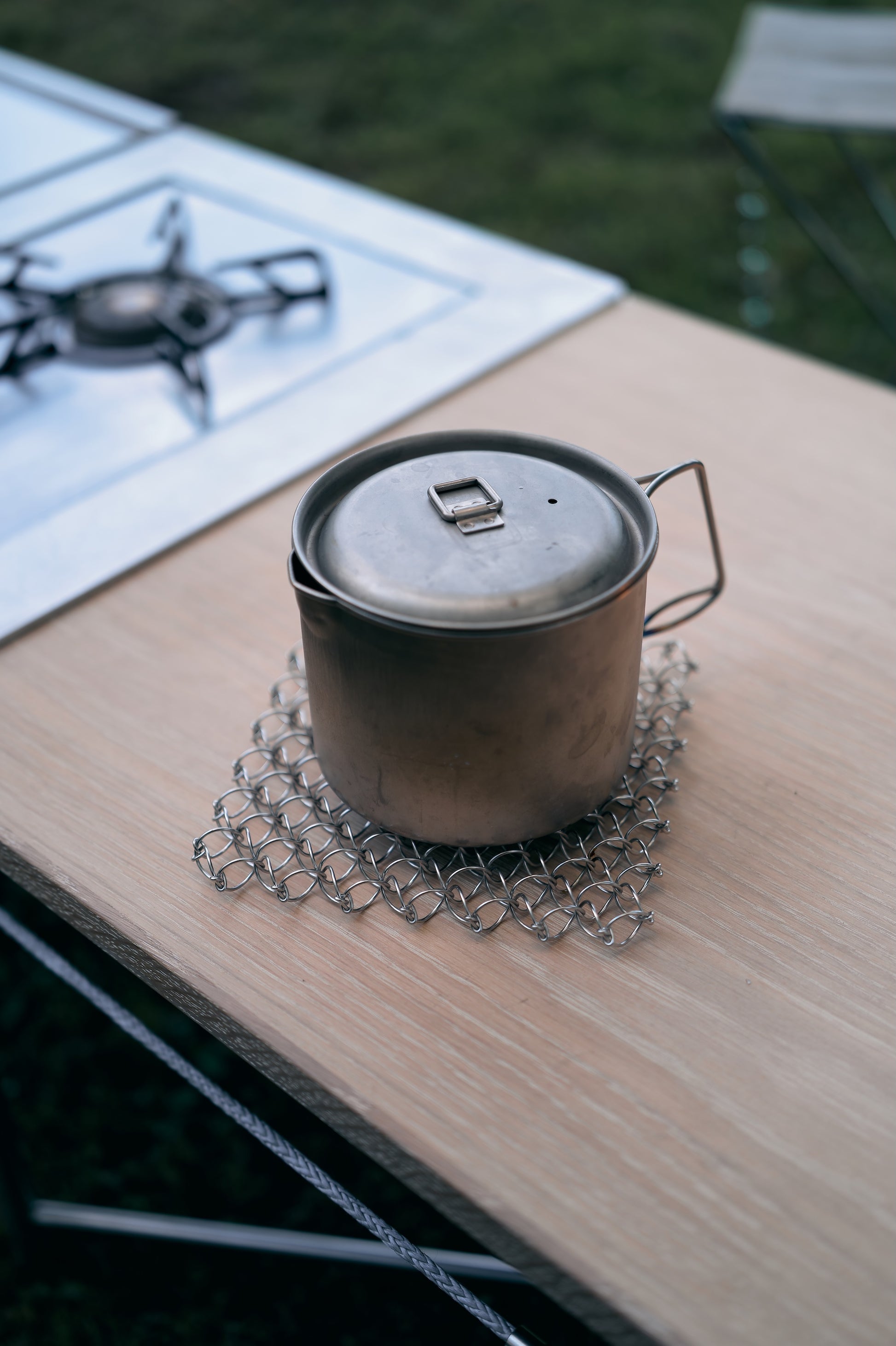 スイスのメーカーで製造が終了したワイヤーポットスタンド。正規輸入代理店の吉祥寺の CINQ と、アウトドアでの持ち運びを想定した小さいサイズを共同開発。以前のモデルは少し大きいと感じていた方も多いのでは。縦横1列小さくすることで、使い勝手と収納のバランスを見直した、住まいの内と外との最適解です。