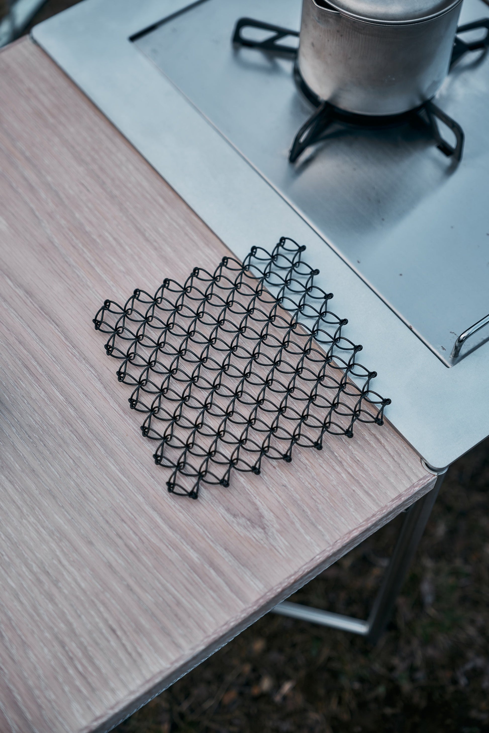 立体的に加工されたワイヤーの網目は美しいだけではなく、ワイヤーの間から熱を効果的に逃がす機能も担っています。また金属製のため木製のポットマットのように焦げる心配もなく、細手のワイヤーはテーブルまで熱を伝えず、驚くほど軽量、しかも十分な強度があります。オブジェとしても魅力的で、一般的な鍋敷きとはひと味違うモダンな雰囲気を醸し出してくれる隠れた逸品です。